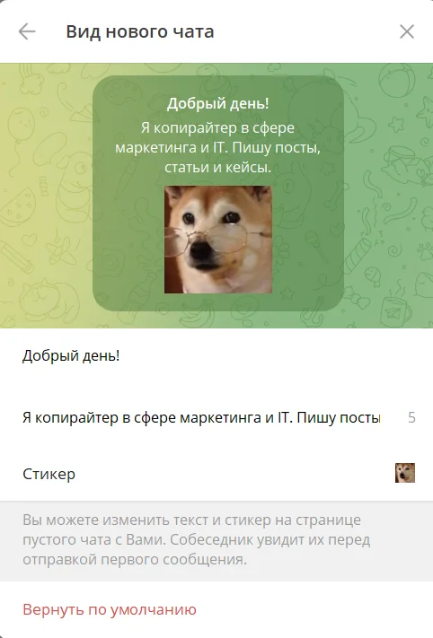 Еще одна новая возможность в Telegram для бизнеса — настройка пустой страницы чата. Сюда можно добавить собственный текст и стикер. Например, краткую информацию о компании и логотип. Эту страницу пользователь будет видеть, когда переходит в чат с компанией впервые.