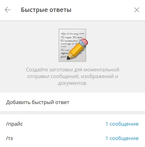 Быстрые ответы — это шаблоны для отправки заранее заготовленных сообщений. Они помогут, если клиенты часто задают одинаковые вопросы. Например, просят отправить прайс-лист или расписание занятий. С помощью быстрых ответов не нужно вручную писать ответ каждому новому клиенту.