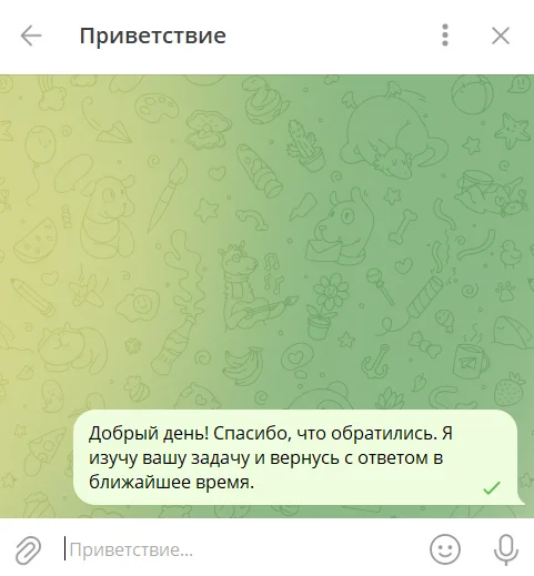 Автоматические сообщения приходят клиентам по заданным сценариям. Можно настроить два вида таких сообщений: «Приветствие» и «Нет на месте».