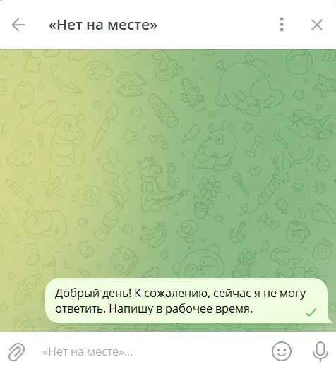 Автоматическое сообщение «Нет на месте» нужно, чтобы сообщение клиента не оставалось без ответа. Например, в нерабочие часы или когда предприниматель в отпуске. В таком случае клиент будет знать, когда получит ответ.