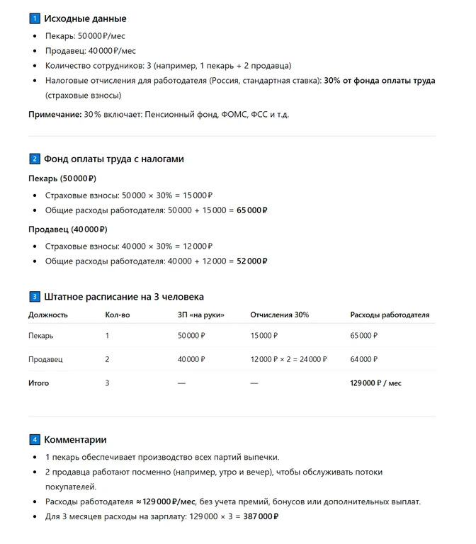 «Средняя зарплата пекаря в моем городе — [X]₽, продавца — [Y]₽. Составь штатное расписание на 3 сотрудников с учетом налогов и страховых взносов».