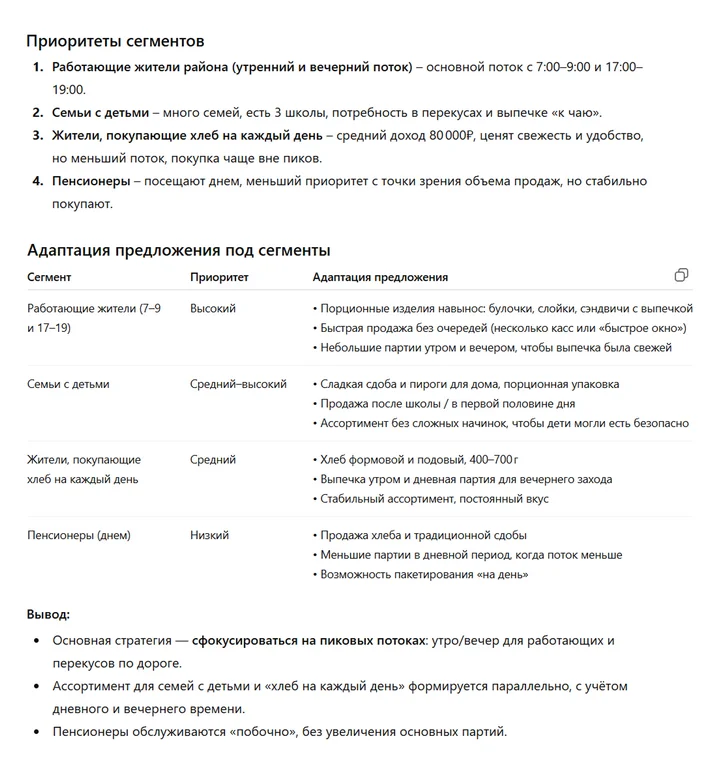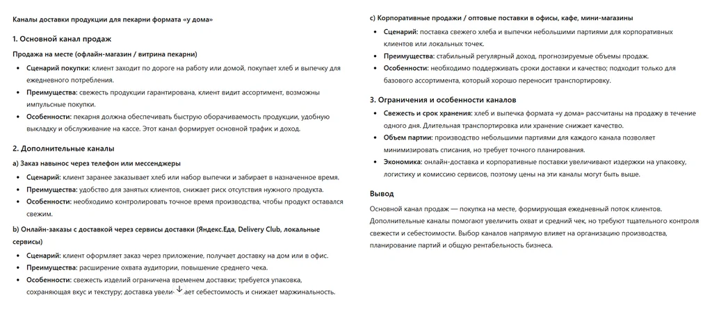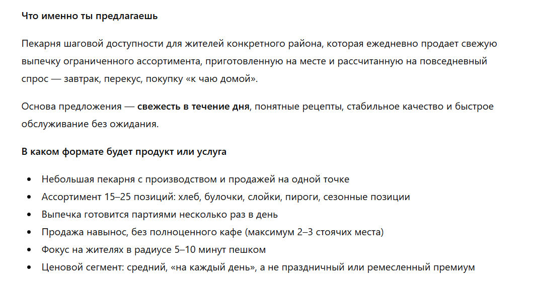 Определяем, что конкретно продает бизнес, за счет чего формируется ценность и как продукт будет выглядеть на практике. Только нужно учитывать, что нейросеть предложит типовой ассортимент на основе общих знаний о пекарнях. Это хорошая основа для размышлений, но финальное меню сформируем после: