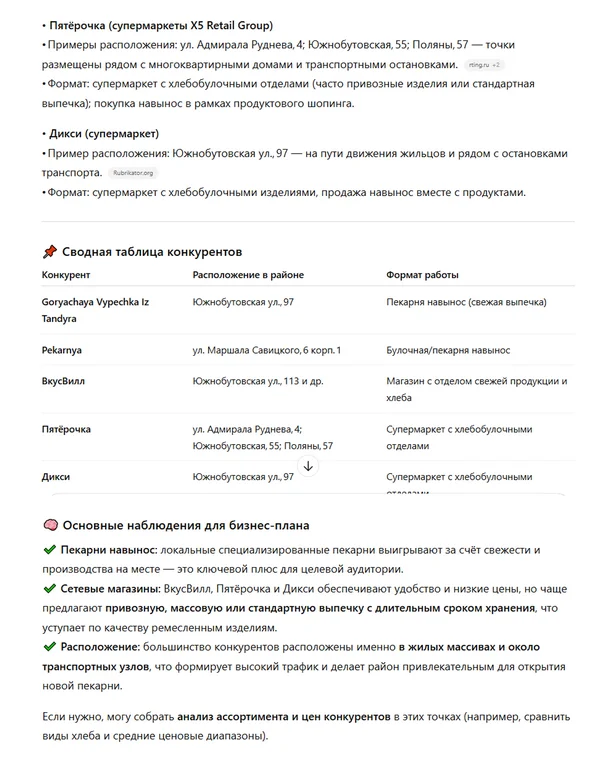 «Найди основных конкурентов для бизнес-плана по пекарне формата “у дома” в спальном районе Москвы Южное Бутово. Укажи: