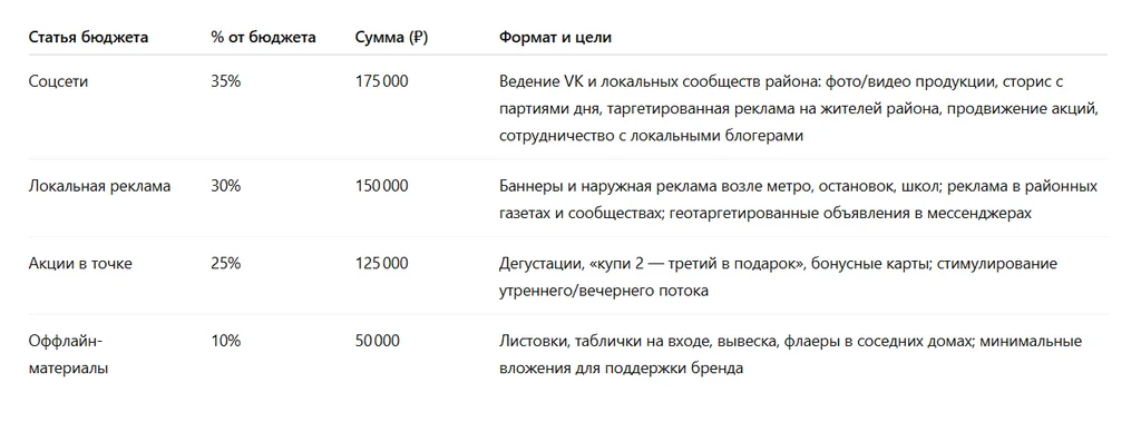 «Мой общий маркетинговый бюджет на первые 3 месяца — [сумма]₽. Распределите по статьям: соцсети, локальная реклама, акции в точке, оффлайн-материалы. Укажи приоритеты».
