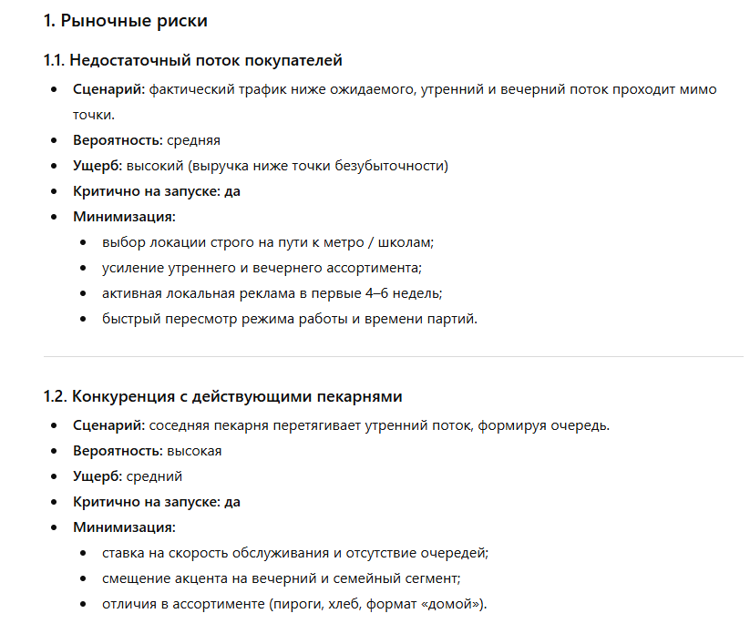 Анализ рисков показывает, какие факторы могут влиять на успех бизнеса и как их можно минимизировать. Отправляем такой промпт:
