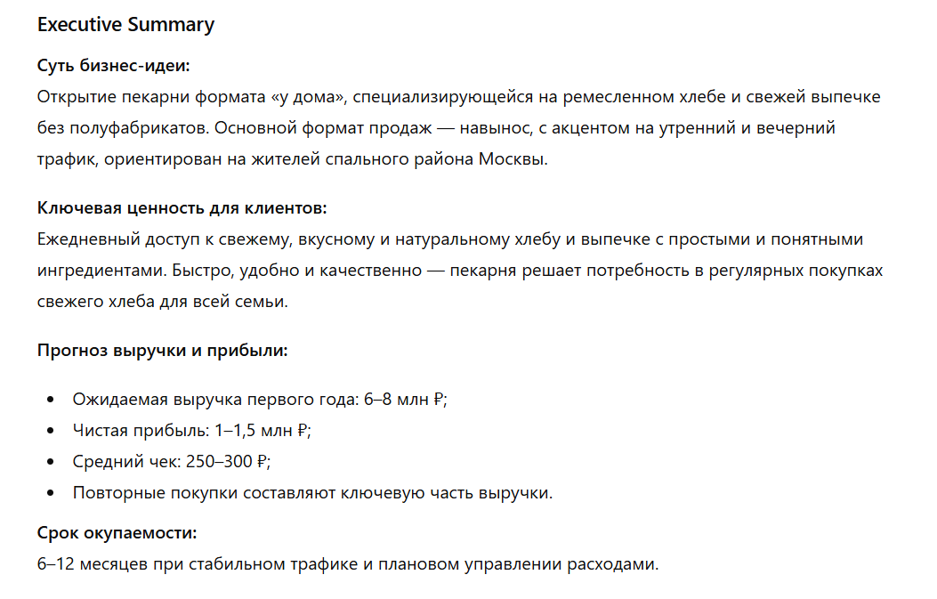 «Составь краткое резюме (Executive Summary) бизнес-плана. Включи: