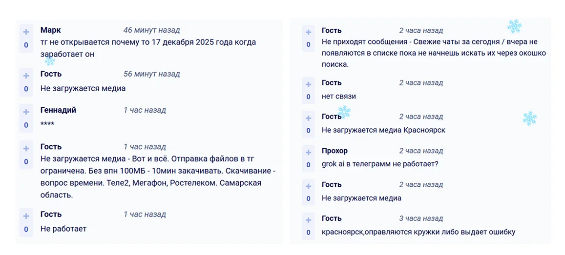Сбои в работе мессенджера. Пользователи по всей стране жалуются на проблемы в работе Telegram. Массовые сбои были зафиксированы в сентябре 2025 в Санкт-Петербурге, Ямало-Ненецкого автономном округе, Хабаровском крае, Воронежской и Саратовской областях. В октябре жалобы на перебои поступали от жителей юга России: Краснодарского и Ставропольского края, Адыгеи, Ростовской и Астраханской областей. Источник РБК тогда рассказал, что проблемы с доступом могли быть связаны с работами по настройке защиты от угроз.