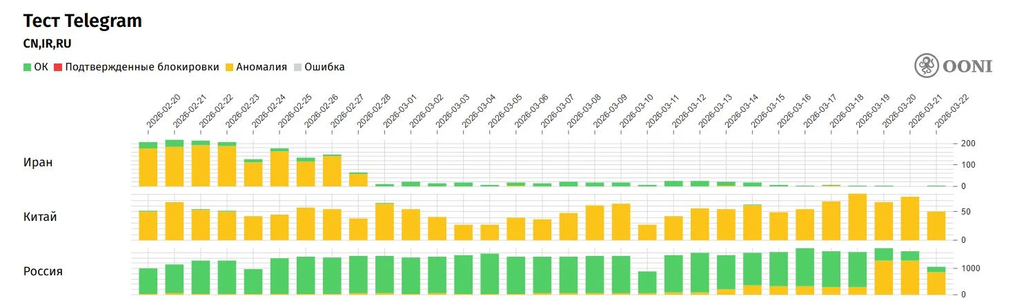 И чем ближе к заветной дате 1 апреля, тем хуже становилось с доступностью мессенджера. По данным аналитической платформы OONI, в воскресенье 22 марта 2026 года доля аномалий в работе Telegram в России составила около 80%.