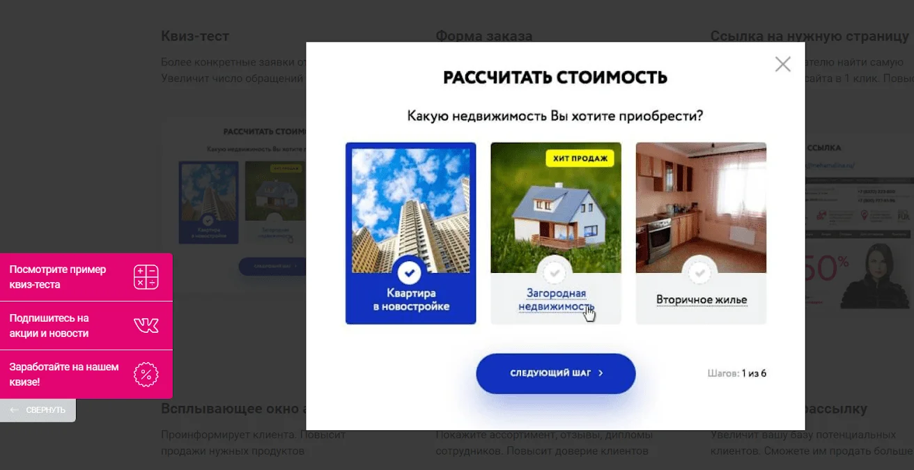 Чем полезен. Поможет увеличить количество заявок с помощью специального виджета на сайте. Клиент отвечает на несколько вопросов о том, что именно его интересует, и оставляет свои контакты. После этого менеджер с ним связывается и обсуждает конкретный запрос. Самый распространённый квиз-тест — расчёт стоимости.