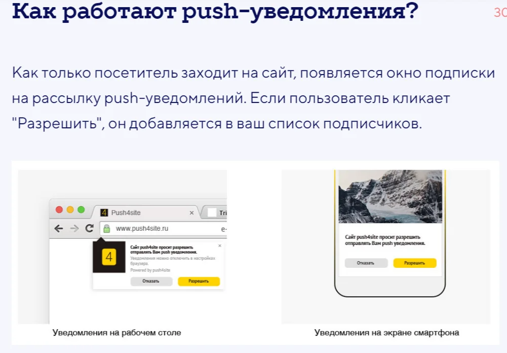 Чем полезен. Push-уведомления доставляются и на компьютеры, и на мобильные устройства даже при закрытом браузере. Можно настроить разные уведомления в зависимости от поведения пользователя на сайте и его интересов, напоминания о брошенной корзине. Сервис позволяет добавлять в сообщения изображения и кнопки. Установка push-уведомлений на сайт занимает меньше 5 минут.