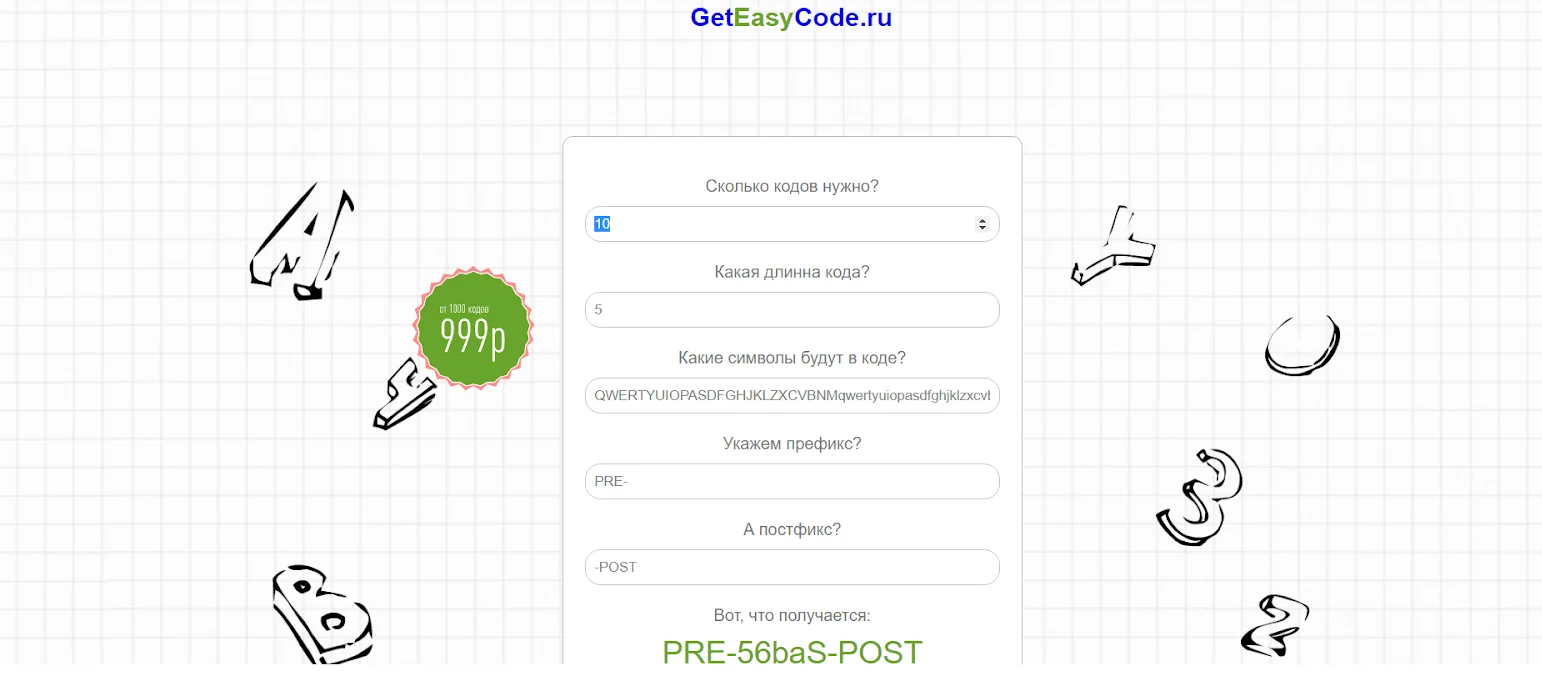 Чем полезен. Многофункциональный генератор промокодов, ориентированный на интернет-магазины. Позволяет создать от 1000 до 10 млн кодов за раз и сохранить их в удобном формате. Есть индивидуальные настройки формата кода.