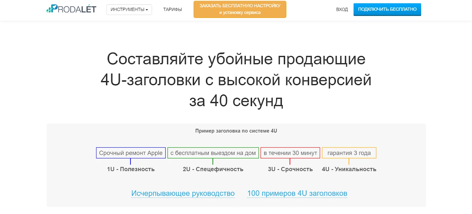 Чем полезен. Генератор продающих заголовков по формуле 4U. Есть подробная инструкция, о чём писать в каждом блоке, и большой список примеров.