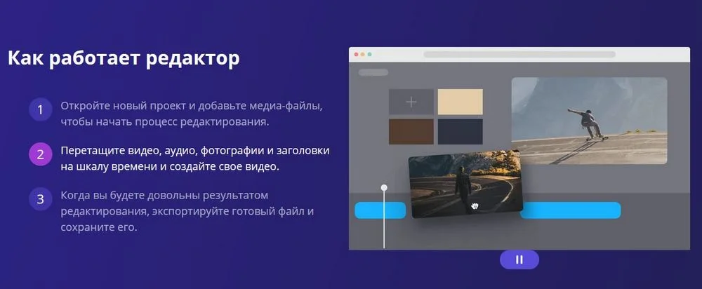Чем полезен. Онлайн-редактор видео с интуитивно понятным интерфейсом. Есть все основные фишки: обрезка, цветокоррекция, кадрирование, поворот, разделение дорожек, работа со слоями, обработка звука, добавление текста и музыки.