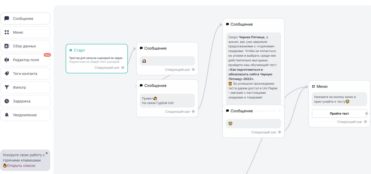 Чем полезен. Можно создать чат-бота для Telegram, причём для этого не нужно знать код, все сценарии настраиваются вручную. Можно посмотреть статистику по подписчикам и подробную аналитику по каждому боту, настроить задержку и запросы во внешние сервисы через API.