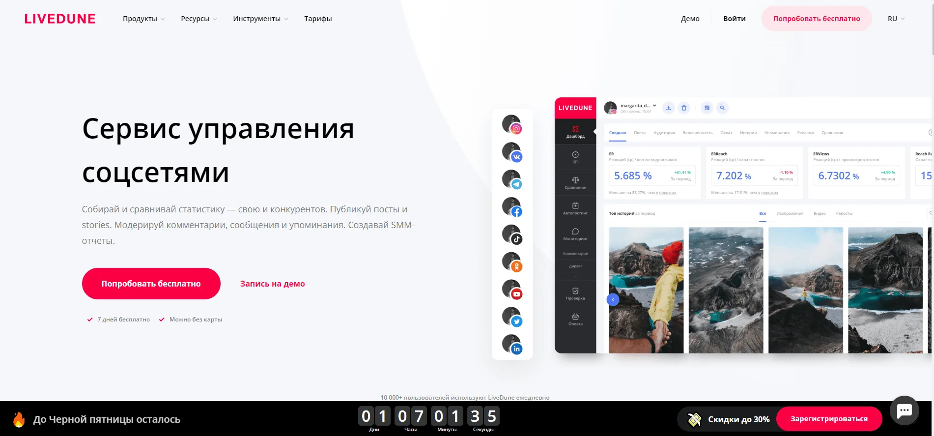 Стоимость. 7 дней бесплатно, далее — от 599 ₽/мес. за каждую соцсеть.