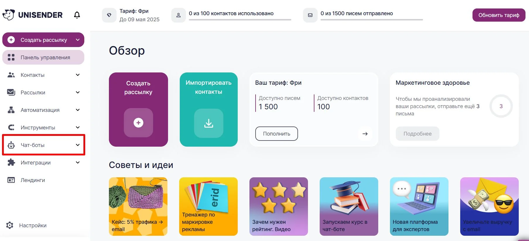 Базовый бот готов: теперь переходим в Unisender, чтобы настроить сценарий.