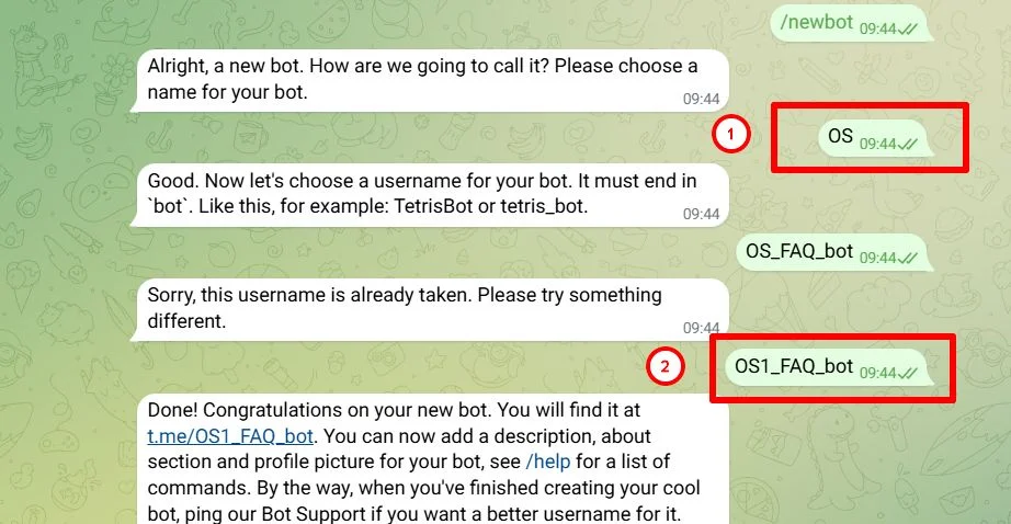 @BotFather попросит придумать имя новому боту, а после ― юзернейм. Важно, чтобы последний был уникальным и заканчивался на «bot». Иначе бот попросит написать другой вариант, как это получилось в нашем случае.