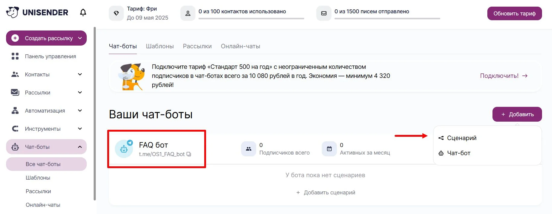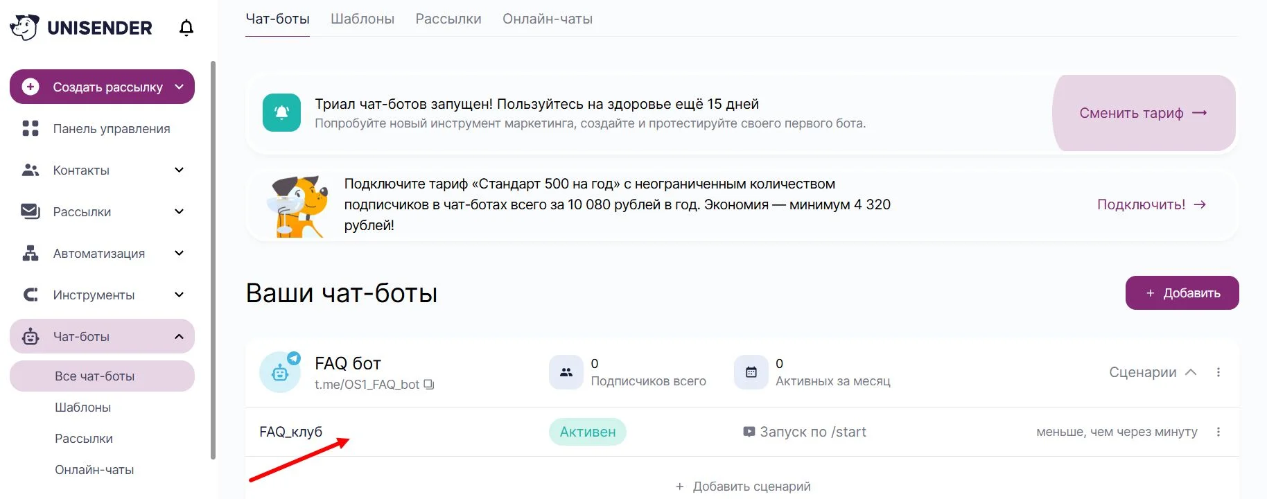 Теперь проверяем, как работает сценарий, чтобы при необходимости его скорректировать через личный кабинет Unisender, нажав на сценарий нужного бота.