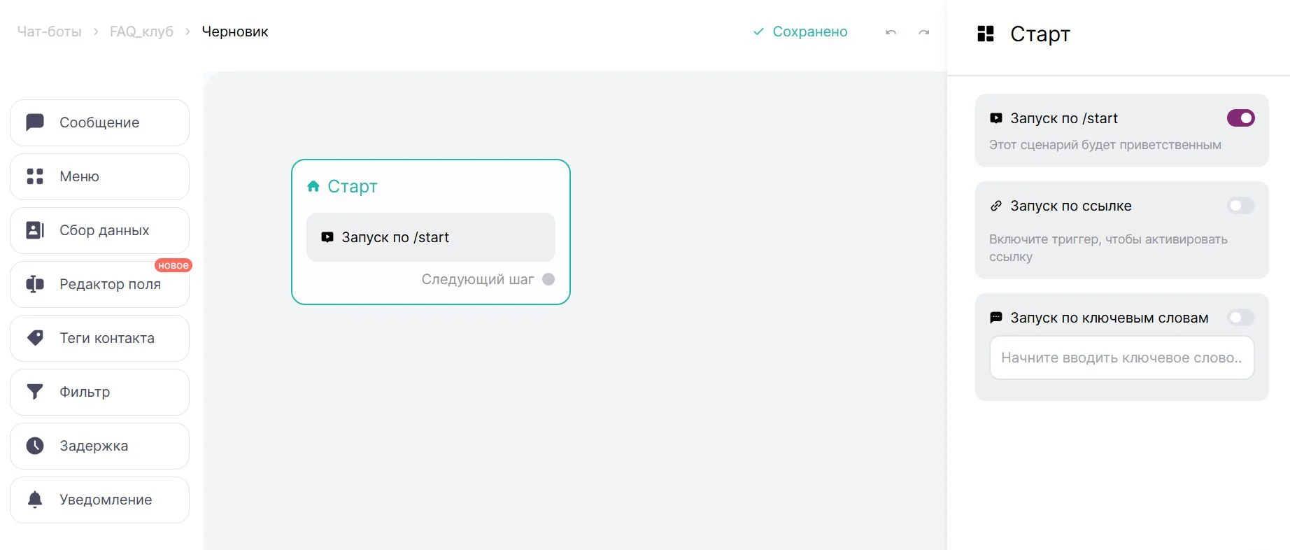 Чтобы начать редактирование сценария, нажимаем на кнопку «Изменить» в правом верхнем углу. Дальше ― на сообщение «Старт», потому что взаимодействие с любым ботом начинается с него. Чтобы активировать бота, можно придумать ключевые слова, использовать ссылку или команду /start. Мы остановимся на последнем варианте.