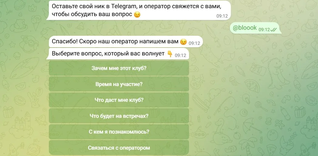 Бот обратной связи готов. Теперь можно делиться ссылкой на него с новыми и потенциальными участниками клуба, чтобы они могли быстро получить ответы на вопросы, а операторы не тратили на это время.