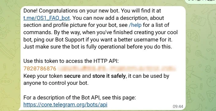 Для подключения к Unisender потребуется токен, который бот пришлет в ответ на согласованное имя. Можно скопировать его сразу или вернуться позже, когда начнете работу с конструктором.
