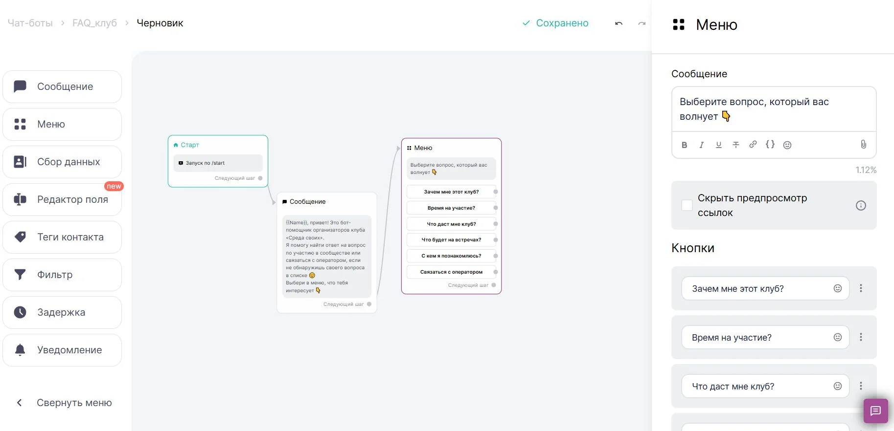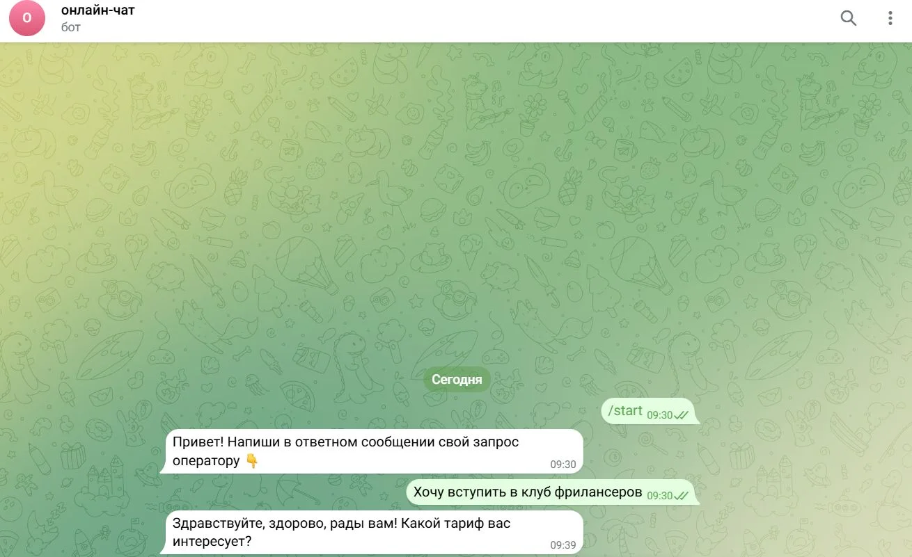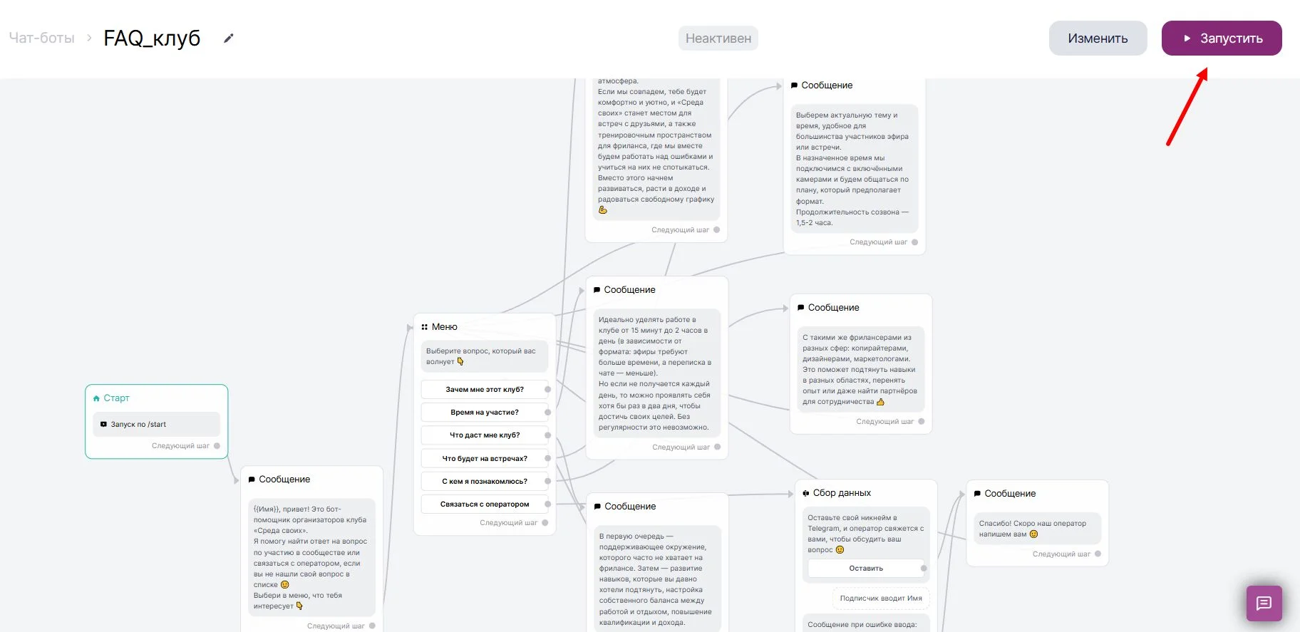 Сценарий настройки зависит от цели. Посмотрим, как его создать, на примере бота для клуба фрилансеров, который будет давать ответы на часто задаваемые вопросы пользователей и собирать контакты для связи.