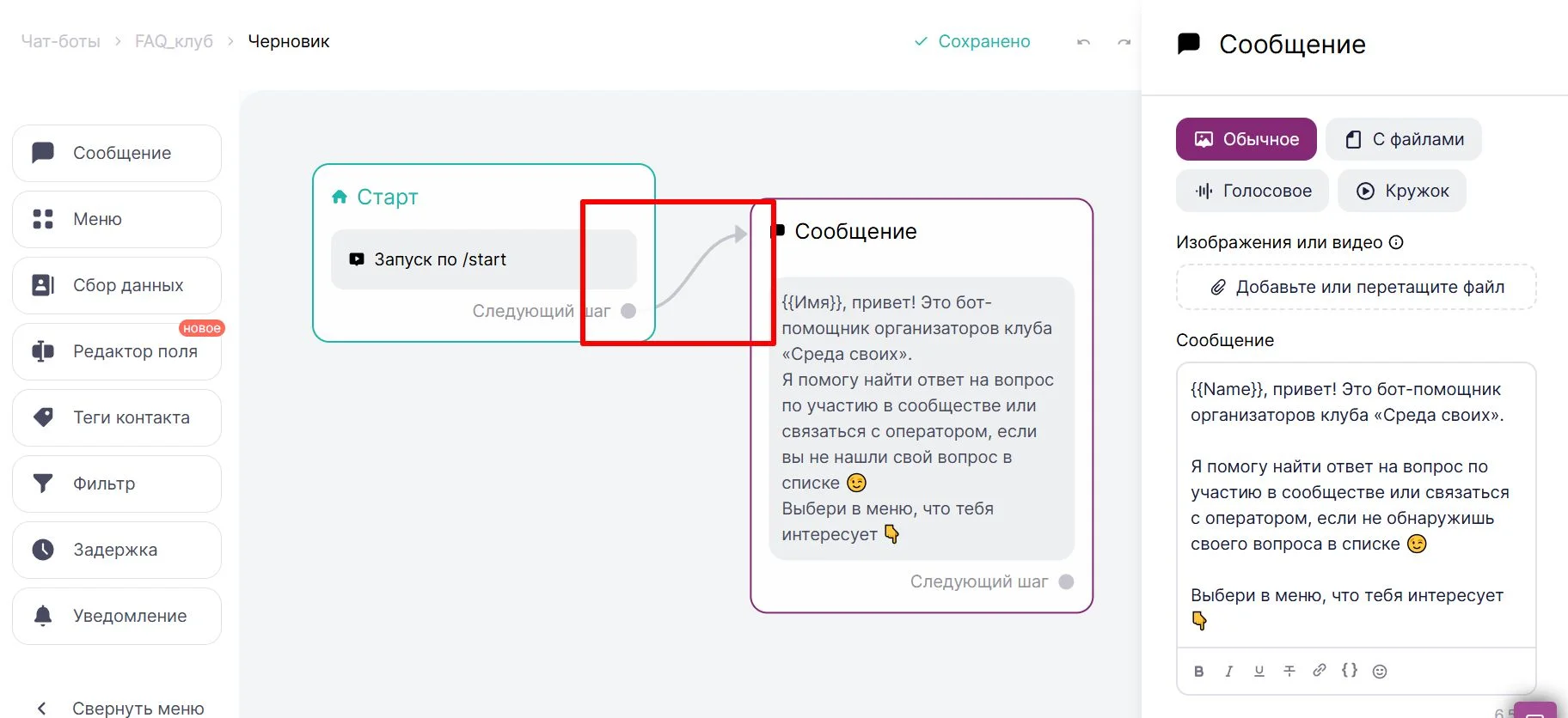 Далее настраиваем шаги по запланированному сценарию. Всё интуитивно понятно: добавляем приветственное сообщение и связываем со стартом стрелкой, чтобы обозначить последовательность. Конструктор дает возможность настроить приветствие текстом, в виде голосового или видео, прикрепить файлы.