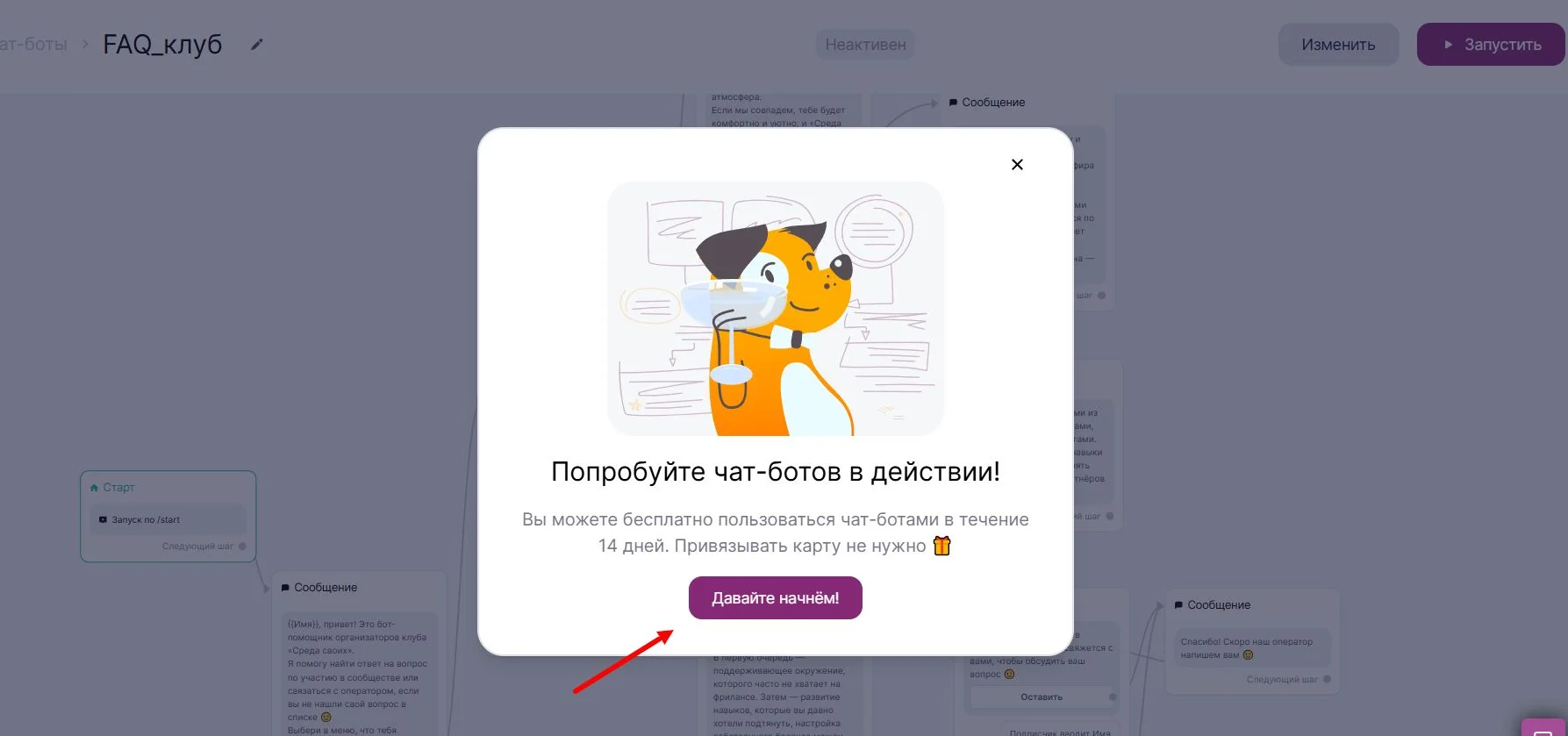 Бота можно протестировать бесплатно в течение 14 дней, дальше потребуется оплатить тариф «Стандарт» за 1200 ₽ в месяц. Для теста во всплывающем окне нажимаем «Давайте начнем».