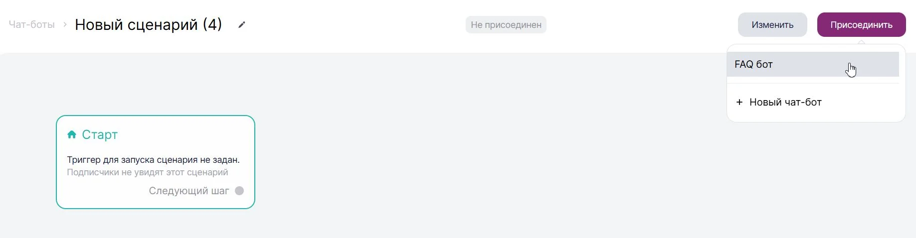 Мы попали в раздел редактирования сценария. Сразу присоединяем нужного нам бота через кнопку «Присоединить» в правом верхнем углу.
