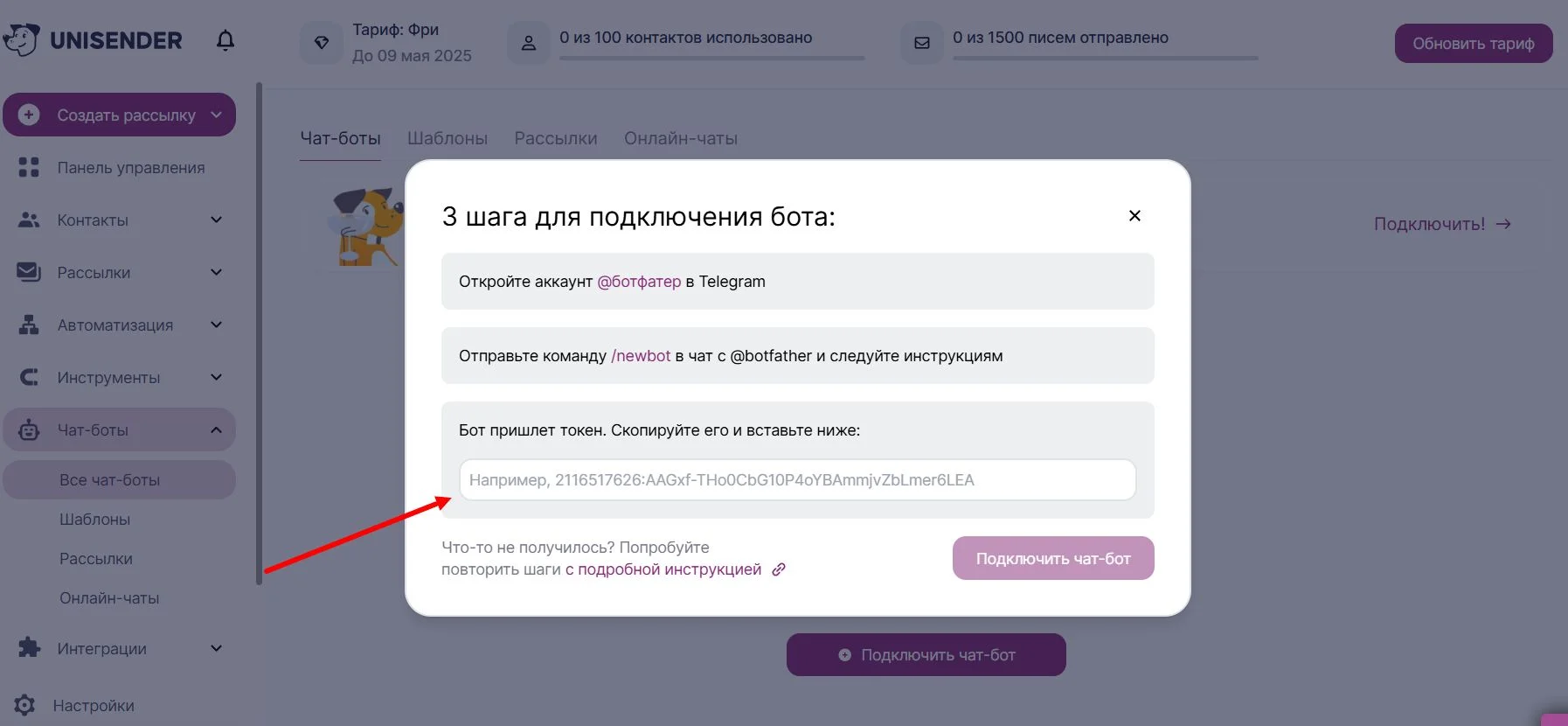 Нажимаем на кнопку и привязываем к Unisender бота, который создали в Telegram. Для этого вставляем в свободное окошко сохраненный токен и жмем на «Подключить чат-бот».