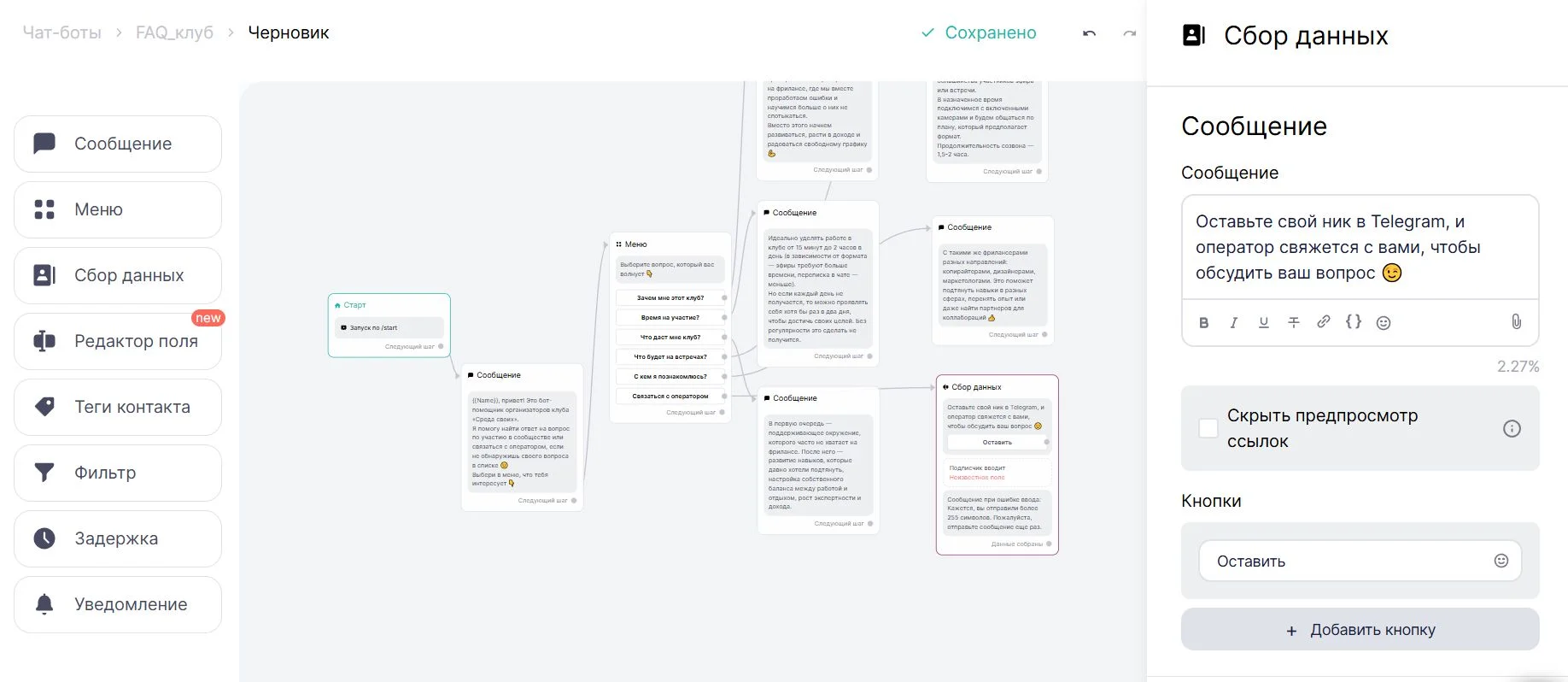 Далее к каждому вопросу добавляем сообщение с ответом и связываем нужный вопрос с нужным ответом. На кнопку «Связаться с оператором» вместо сообщения добавляем блок «Сбор данных», чтобы человек указал свой ник в Telegram для связи.