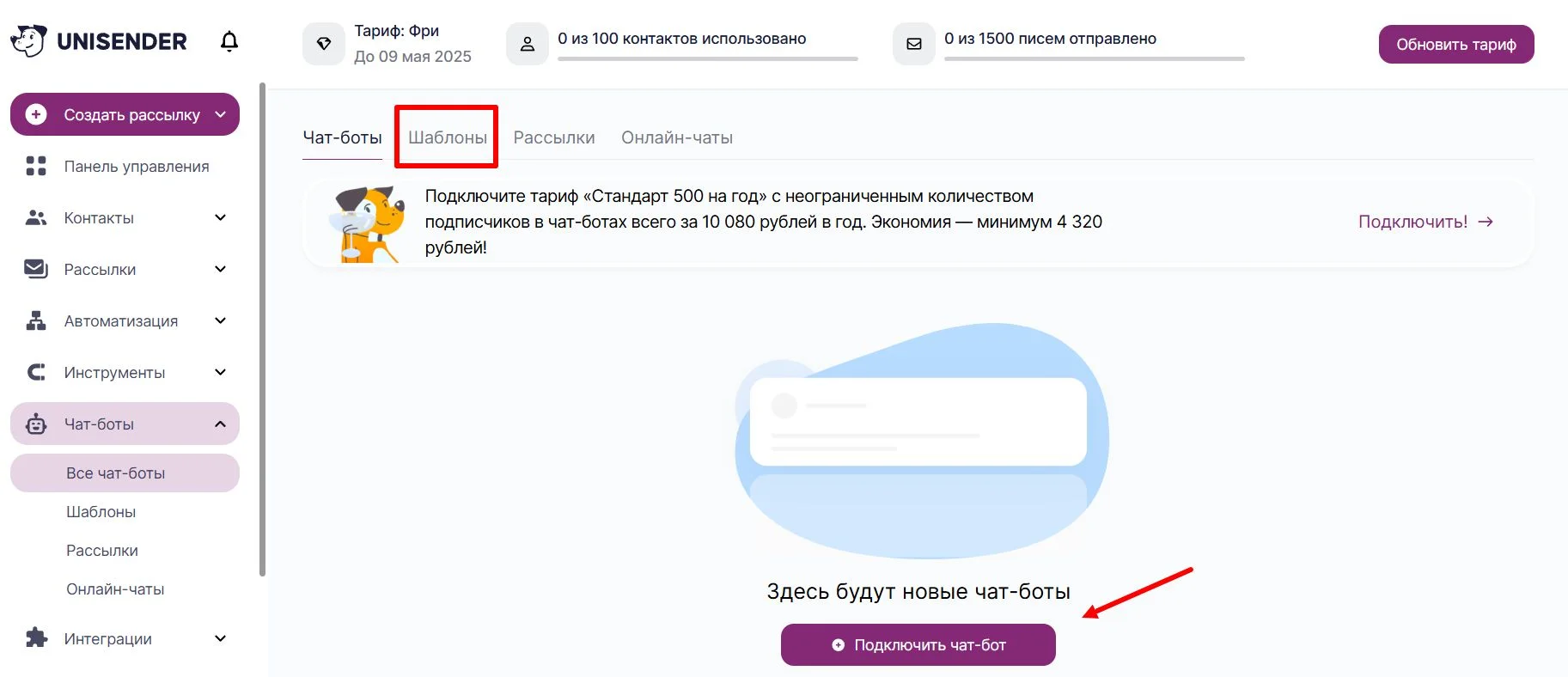 Чтобы подключить нового бота, в открывшемся окне выбираем «Подключить чат-бот» ― под нашу задачу придется создать бота с нуля. Но у Unisender также есть раздел с готовыми шаблонами на разные случаи: например, чтобы быстро настроить бота на прогрев перед вебинаром.