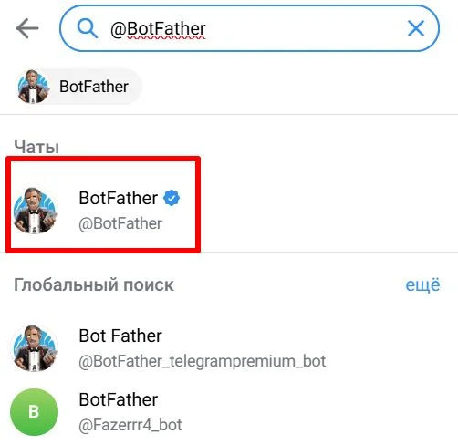 Находим по поиску в Telegram «отца всех ботов» ― @BotFather. Нам нужен официальный аккаунт с синей галочкой верификации.