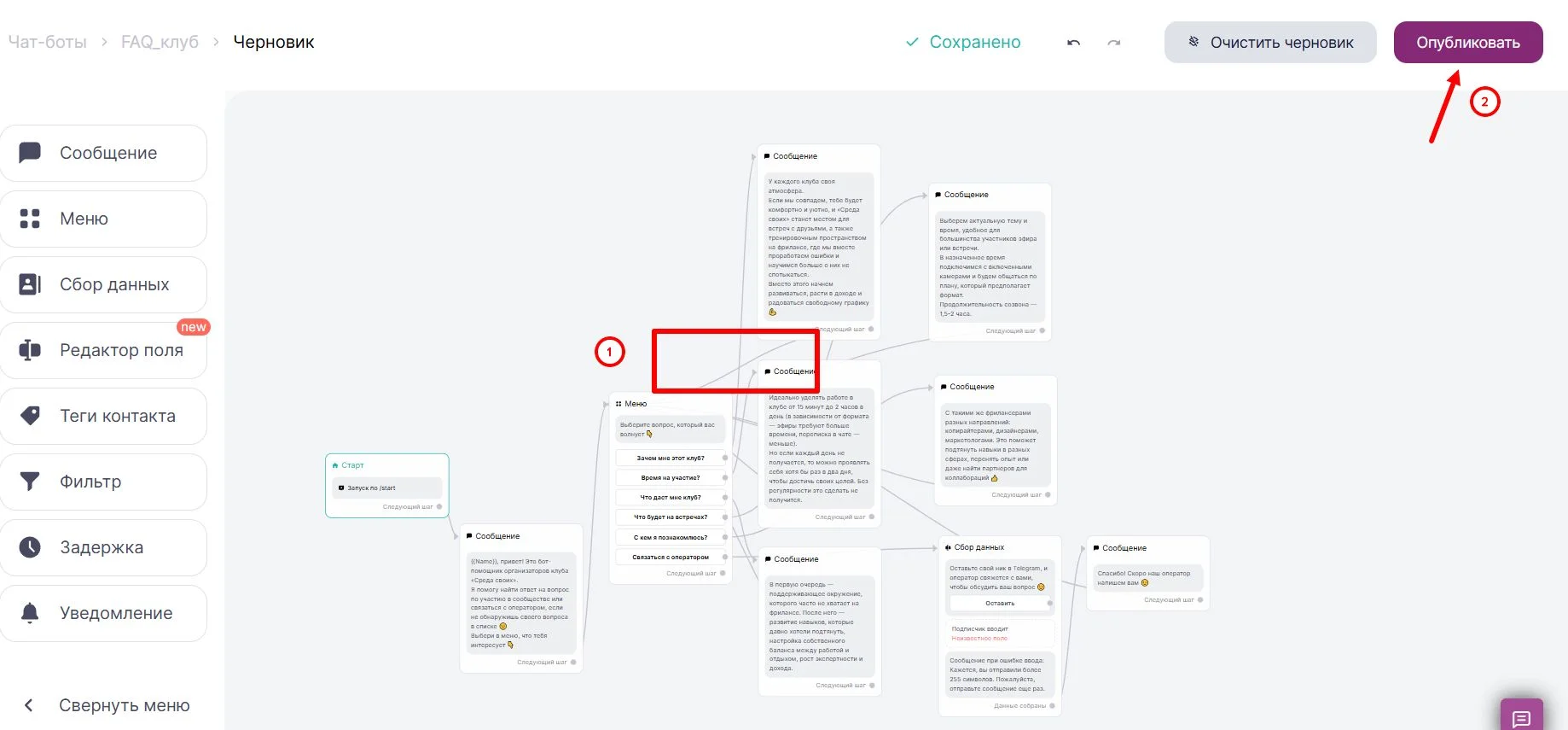А после кнопки сбора данных добавляем сообщение-благодарность. И, чтобы человек мог вернуться к меню после любого действия, связываем все незакрытые шаги с блоком «Меню». Нажимаем «Опубликовать».