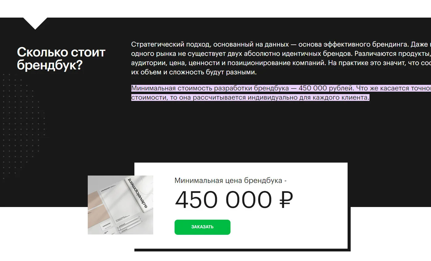В креативном агентстве Greenmars, полноценный брендбук с характеристикой бренда и дизайном стоит от 295 000 ₽. А вот другие примеры цен: