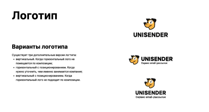 Например, у Unisender брендбук появился не сразу, сначала был только логотип, и его использовали без всяких правил. Потом креативный копирайтер предложила сделать брендбук из-за того, что разные отделы компании действовали вразнобой. Например, у нас даже не было правила как правильно писать «UniSender» или «Unisender» — в итоге решили полностью перейти на написание без большой буквы в центре слова.