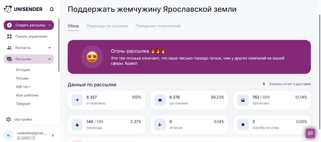 У нас сейчас общая база — около 6500 человек. В основном люди приходят из соцсетей, подписываются на сайте, оставляют свои контакты на наших мероприятиях и когда совершают пожертвования. Открываемость не слишком большая, 11–13% — по всей базе, не только по лояльной аудитории, — и кликабельность на уровне 1–3%. При этом Unisender нас хвалит: индикаторы сервиса показывают, что рассылки работают хорошо. Это мотивирует, хотя результаты могли бы быть и выше.