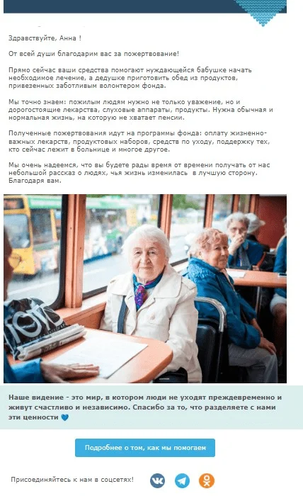 Мы продолжаем автоматизировать коммуникацию: хотим внедрить триггерные письма по событиям (первое пожертвование, годовщина первого пожертвования и пр.), сегментировать по сумме, по типу помощи, развивать корпоративные партнерства с помощью рассылок.