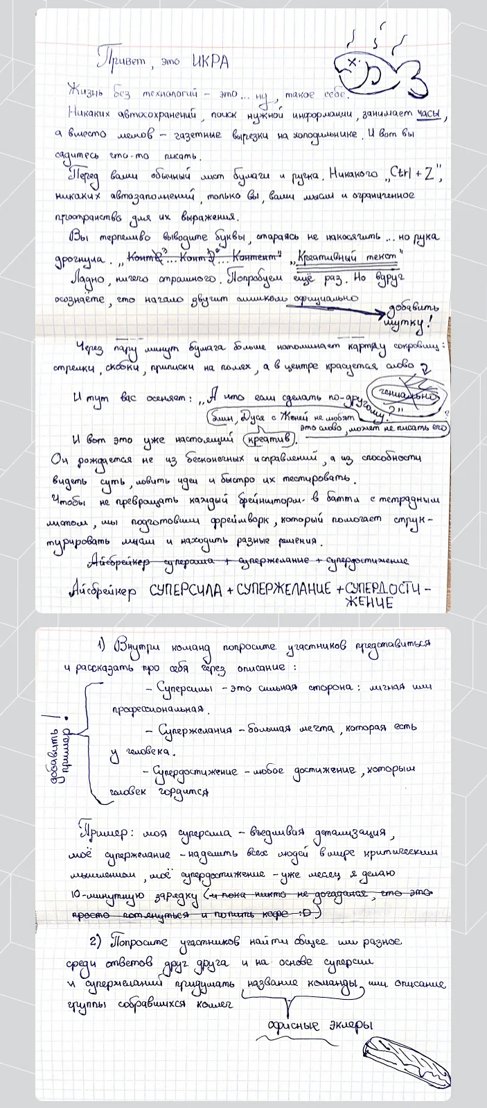 Сначала мы определили, зачем вообще такое письмо. Просто рукописный текст — это мило, но недостаточно. Решили дать реальную пользу: два айсбрейкера из нашего набора по управлению встречами. Читателям пришлось бы «расшифровывать» написанное — это добавляло интерактива.