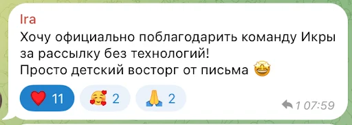 Это не рекордные наши цифры, но они были хороши в сравнении с последними письмами, после которых мы и решили пойти на эксперименты. Для сравнения: хороший OR в email-маркетинге — около 15-20%, а CR — 2-5%. Так что в рынке. Это необычный формат, без кучи ссылок, и главное — он вызвал эмоции. Подписчики писали нам личные сообщения: «Это очаровательно!», «Как будто получил письмо от друга».