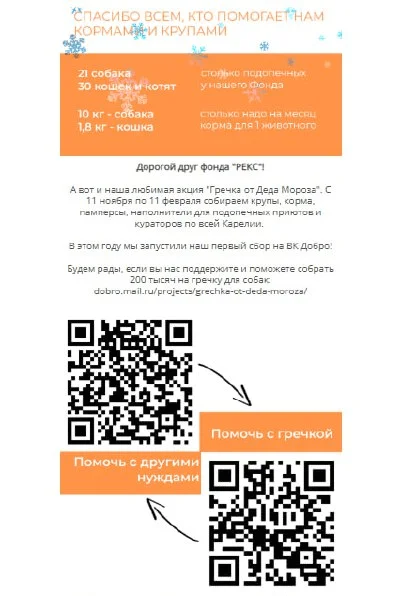 В фонде есть традиционная акция — «Гречка от Деда Мороза». Она проходит каждый год с ноября по февраль. Мы собираем крупы, корма и деньги, чтобы обеспечить помощью приюты Карелии. У нас есть список организаций, которым мы помогаем регулярно — и которые сильно зависят от подобных сборов.