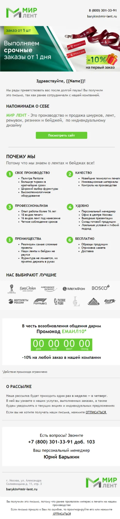 У каждого менеджера своя база из клиентов, которые уже делали заказы на промосувениры. Письма отправлялись от имени конкретного сотрудника.