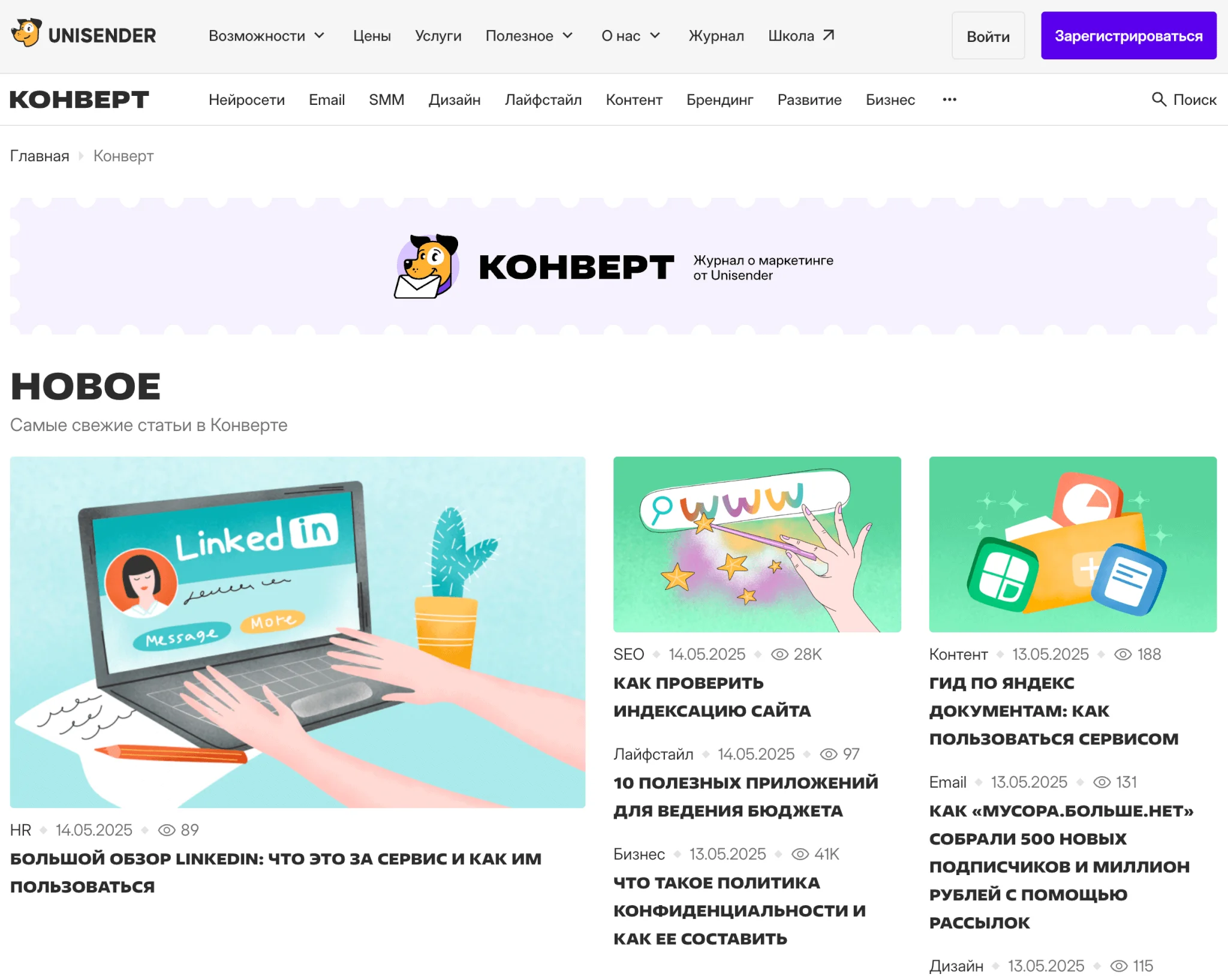 Мы пишем про маркетинг во всех его проявлениях, рассказываем, как создавать email-рассылки и сайты, привлекать трафик и продвигаться в интернете. А ещё у нас есть База знаний о работе в сервисе рассылок Unisender и Словарь маркетолога.