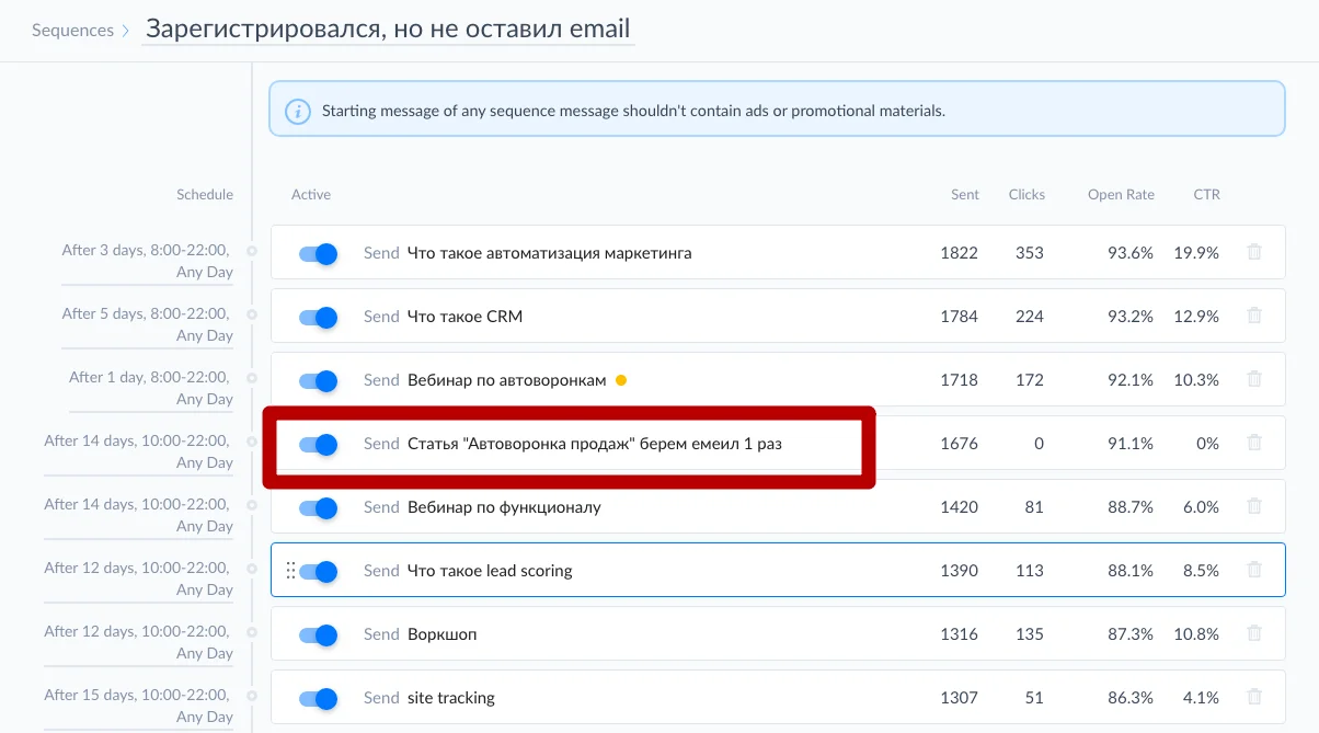 В интернете много пишут про пользу автоворонок продаж. Если вкратце, автоворонка — это система, которая на автомате ведёт подписчика от его первого контакта с компанией до целевого действия. Элементы автоворонки анализируют действия подписчиков и как-то на них реагируют: отправляют разные типы писем, шлют SMS, сигнализируют менеджеру о необходимости звонка.
