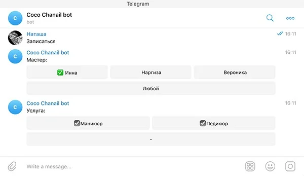 К примеру, вот запись на маникюр и педикюр к конкретным мастерам салона: клиент видит переменные (команды, даты, имя специалиста) и просто выбирает то, что ему подходит.