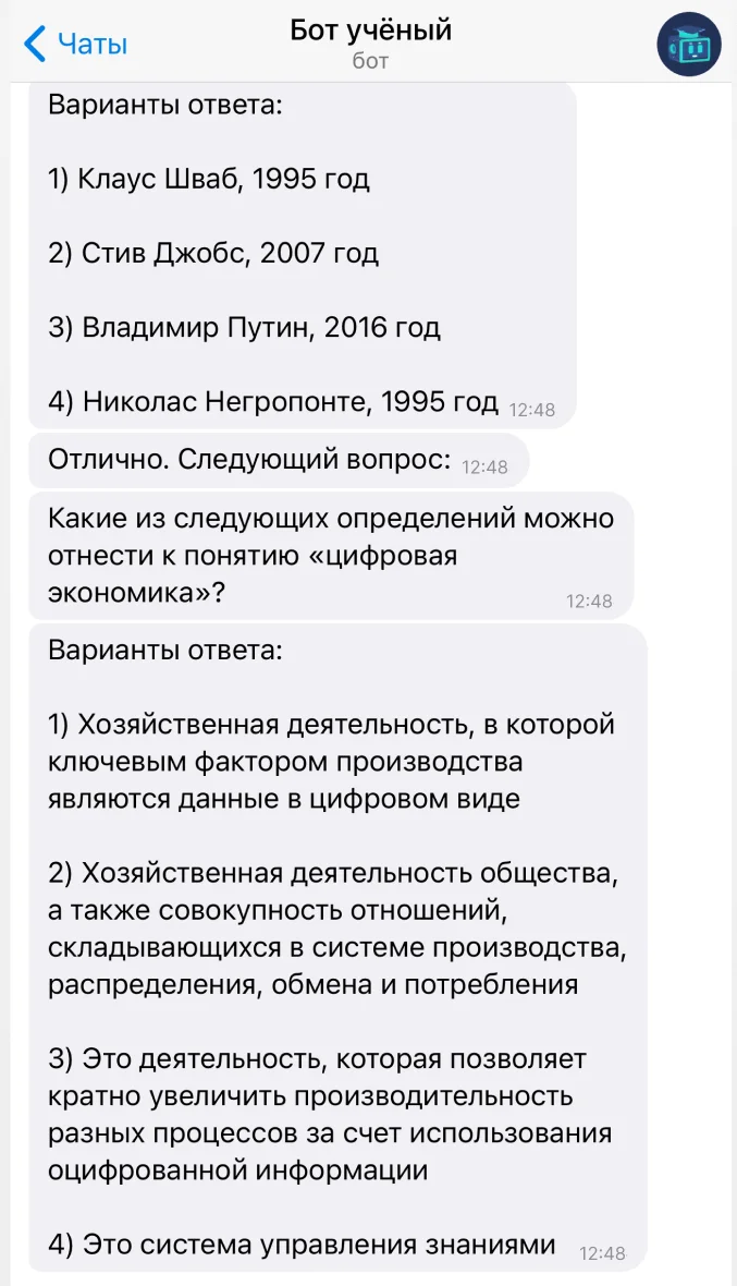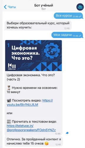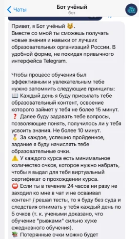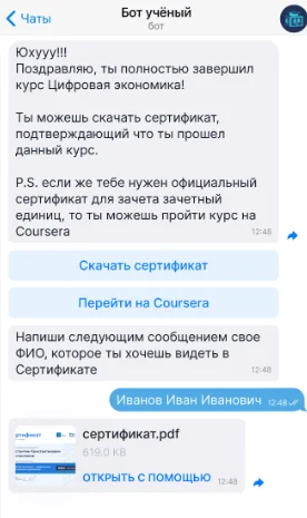 Так появился Бот учёный — образовательный чат-бот, который предлагает пройти курс «Цифровая экономика» от МФТИ и получить именной сертификат о том, что ты прослушал столько-то часов и набрал такое-то количество баллов.