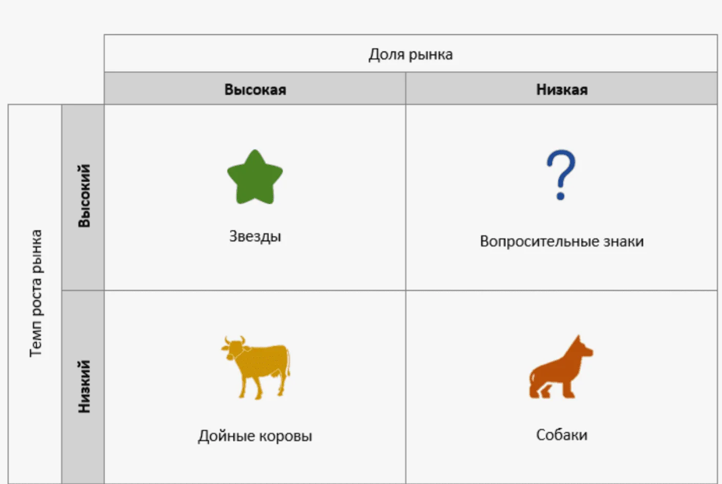 Матрица BCG для анализа продуктового портфеля конкурентов. Boston Consulting Group Matrix — инструмент стратегического анализа, разработанный американской консалтинговой компанией Boston Consulting Group в 1960-х годах. Цель создания матрицы при анализе конкурентов — понять, на какие продукты конкуренты делают ставку и где у них могут быть уязвимые места. Все продукты конкурентов классифицируются как «звезды» с активным ростом и большой долей рынка, «дойные коровы» с высокой долей рынка, но низким ростом, «вопросительные знаки» с низкой долей, но высоким ростом, и «собаки» с низкий ростом и низкой долей рынка.