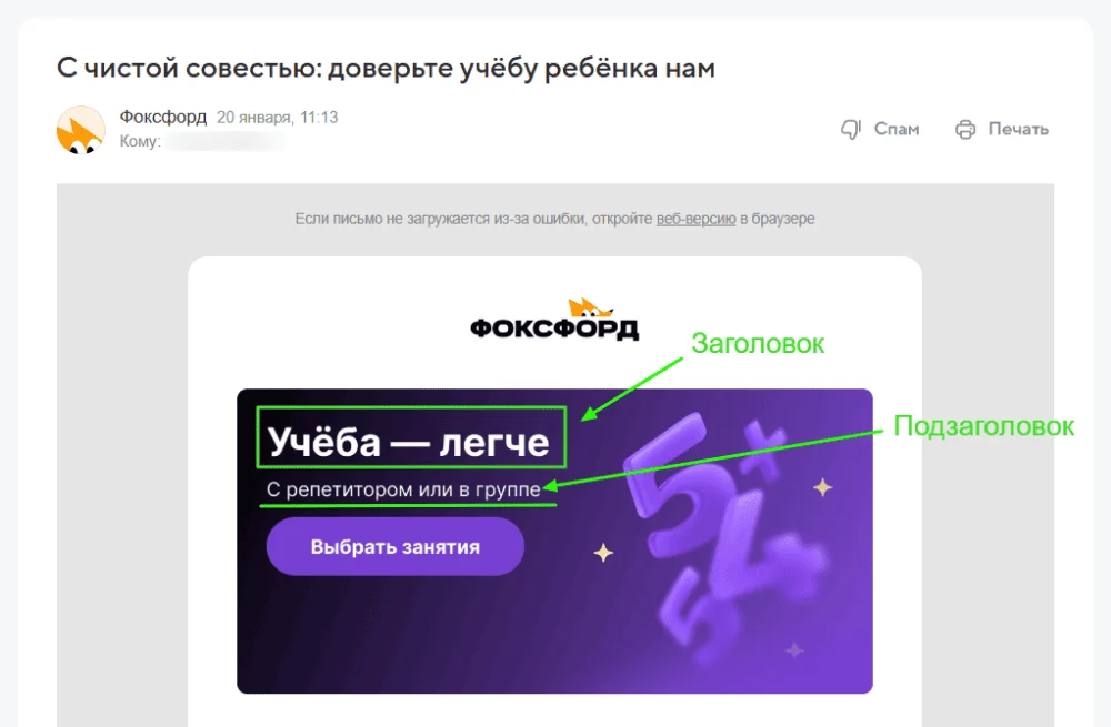 Не стоит путать его с внутренними подзаголовками в теле письма, для которых применяют теги <h2> и <h3>. В отличие от главного заголовка, который открывает сообщение и задаёт общую тему, они лишь помогают визуально дробить информацию на части внутри текста.