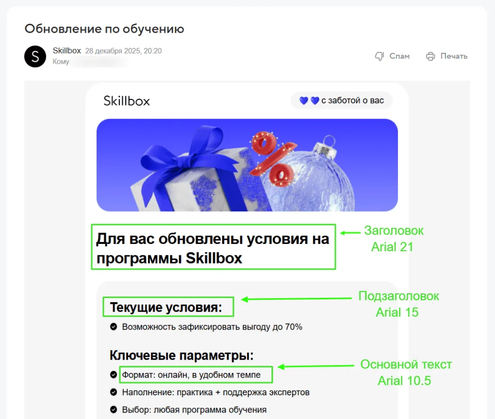 Шрифт заголовка должен быть крупнее и заметнее основного текста письма. Если для основного текста используем 14-16px, то для заголовка — минимум 20-24px. Можно применять тот же шрифт, что и в основном тексте (это создает визуальное единство), но с увеличенным размером и жирным начертанием. Главное правило — читаемость.