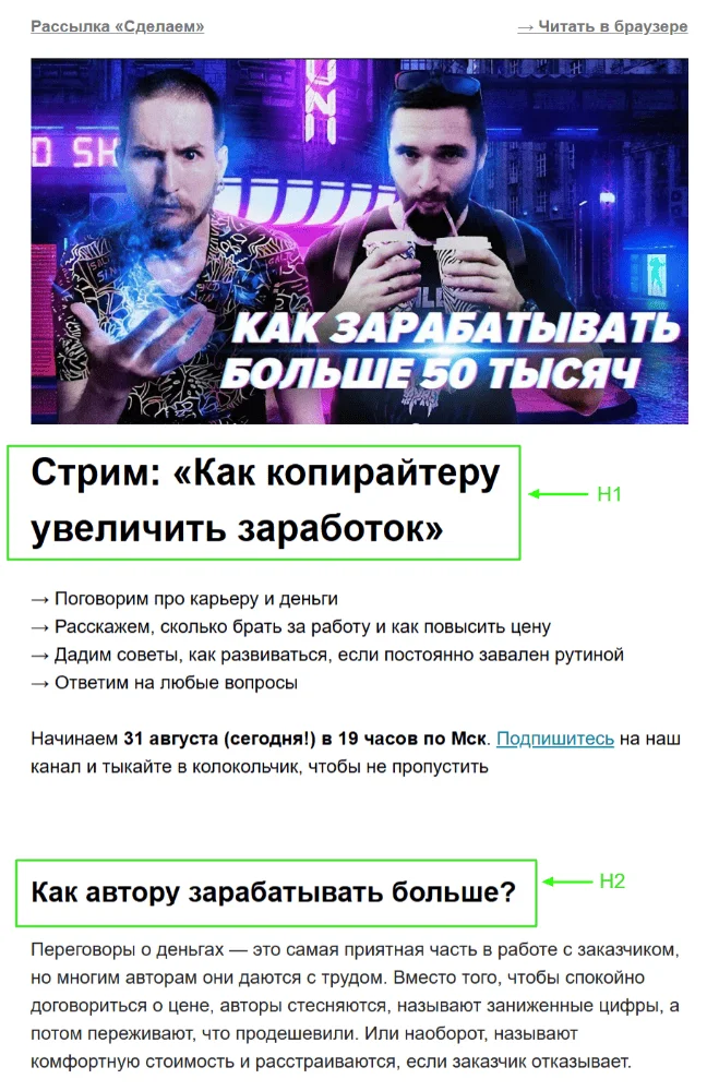 У заголовков, на мой взгляд, всего две функции. Первая — «продать» читателю суть письма. Вторая (и она реализуется вместе с подзаголовками h2, h3) — управлять вниманием аудитории, которая читает текстовый контент по диагонали. Эти элементы помогают провести аудиторию по самым важным смысловым блокам.
